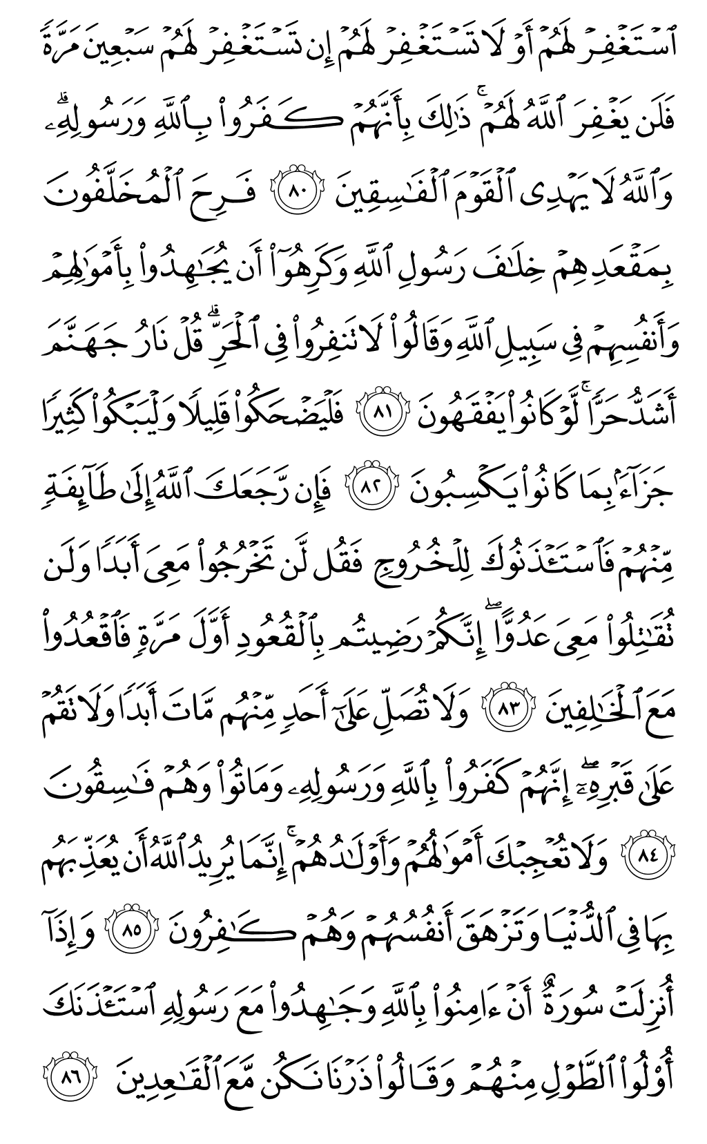 9/АТ-ТАУБА-80: Проси для них замены грехов на благо для них или не проси для них замены грехов на благо. Даже если семьдесять раз попросишь у Аллах'а для них (замены грехов на благо, Он никогда не заменит их грехи на благо (дар)). Вот это из-за того, что они неверовали в Аллах'а и в Его Посланника. И Аллах не обратит нечестивый (падший) народ.